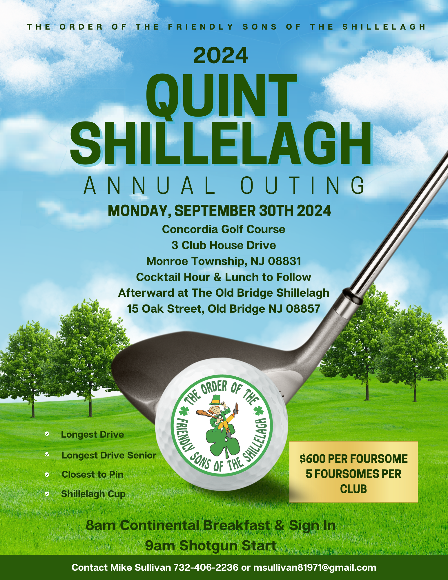 Back to All Events Quint Shillelagh Golf Outing Monday, September 30, 2024 8:00 AM 4:00 PM Concordia Golf Course 3 Club House Drive Monroe Township, NJ 08831 United States (map) Google Calendar ICS